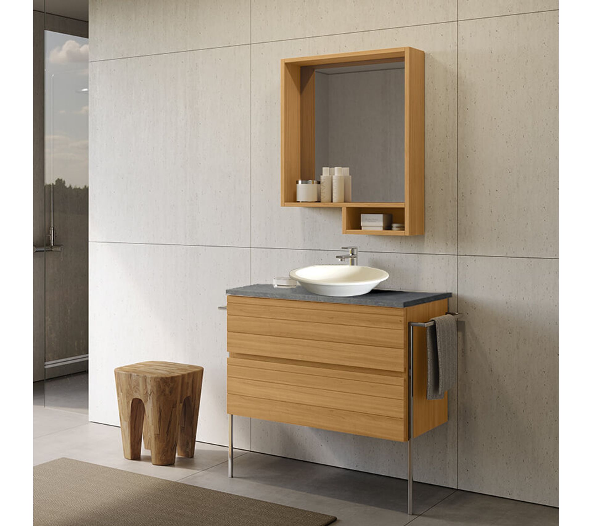 Meuble A Suspendre 80 Cm Aspect Teck Avec Plan Vasque En Ceramique 2 Tiroirs Lago Meuble Vasque But