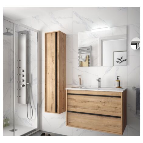 Meuble De Salle De Bain Suspendu 80 Cm Nevada En Bois Couleur Chene Ostippo Avec Lavabo En Porcelaine 80 Cm Avec Double Colonne Miroir Et Lampe A Led Sa85213d