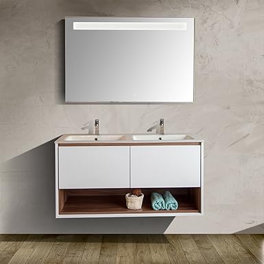 Ensemble Salle De Bains Meuble Ipoma Blanc Mat Plan De Toilette Chene Clair Ikoro Double Vasque Miroir Lumineux L120 X H70 X P50 Cm Oskab