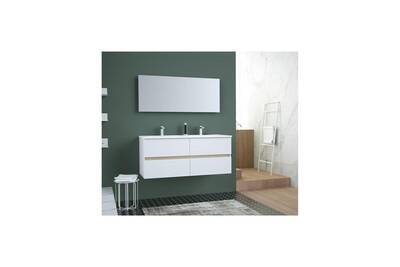 Ensemble Salle De Bains Meuble Ipoma Blanc Brillant Plan Double Vasque Resine Miroir Lumineux L120 5 X H71 5 X P50 5 Cm Oskab
