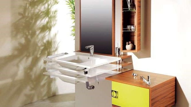 Le plan vasque et les meubles setirent en longueur pour degager le haut des murs bien sur ils sont en bois ou stratifie bois.