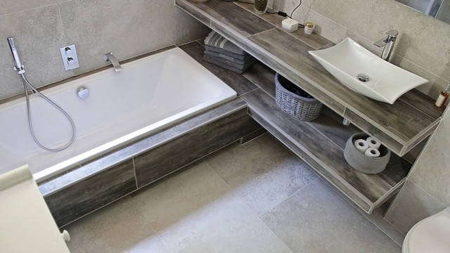 Salle De Bains Principale Carrelage Imitation Pierre Et Bois Contemporain Salle De Bain Autres Perimetres Par Id Projectt
