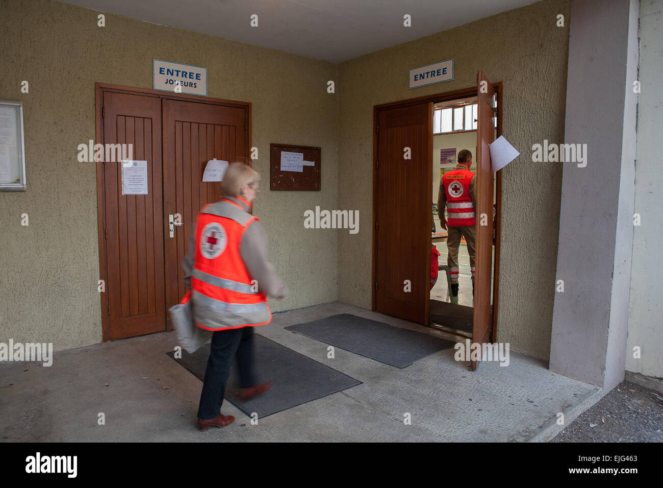 Digne Les Bains Alpes De Haute Provence France 25 Mars 2015 Le Personnel De La Croix Rouge Francaise Entrez Le Hall De Sport Deux Abris Pour Les Familles De Personnes Qui Voyageaient Dans L Avion Qui