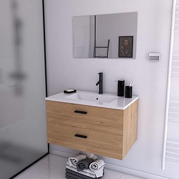 Meuble Salle De Bain Suspendu 80 Cm 2 Portes Tiroir Bois Miroir Lavabo Ceramique Amazon Fr Cuisine Maison